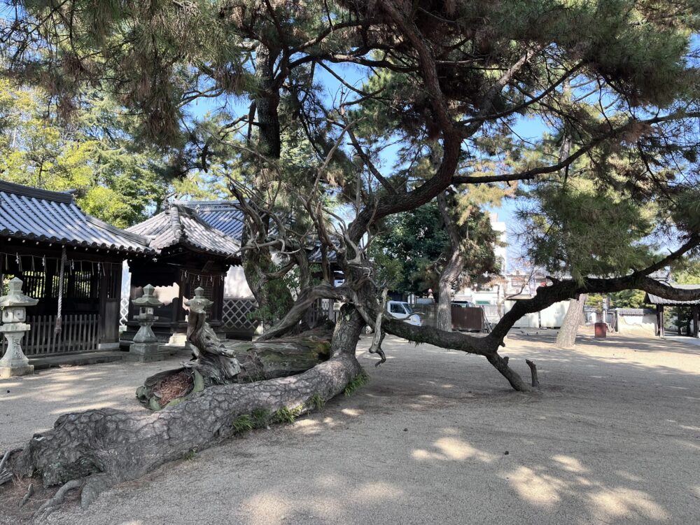 天満宮の前の松の木。倒木と地を這うように枝を伸ばしている松の木のコラボ。